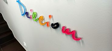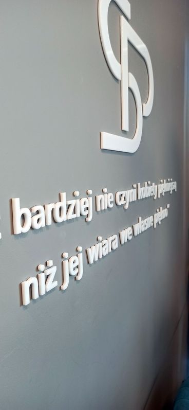 Letters made of clear acrylic glass with colored foil glued on the bottom. The whole thing is attached at the reception desk with special invisible distances, which gives the office a unique look. The cut material has polished edges so that the light perfectly penetrates the letter and causes an additional play of shadows on the foil surface. The "wow" brick effect :-)